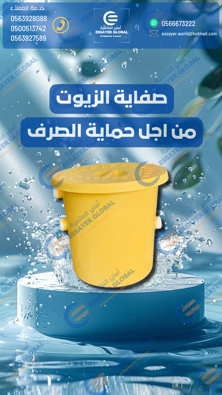 مصايدة الزيوت والشحوم هي الحل الأمثل من أجل حماية شبكة الصرف الصحي , يتم تصنيع مصائد الزيوت بعدة أحجام، هذه الاحجام ترتبط بحجم المنشأة المخصصة لها كما ان التدفق المطلوب هو عامل مهم وأساسي لاختيار المصيدة المناسبة للمنشأة (للفنادق والمدن الصناعية والمشاريع الحيوية)